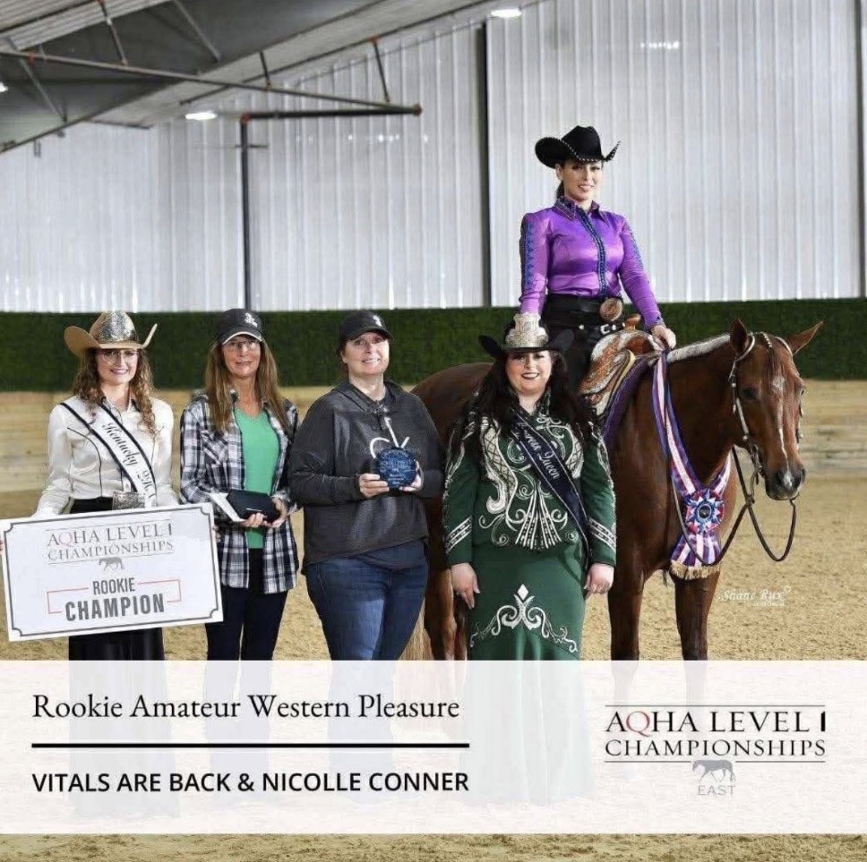 Vitals Are Back is a quality mare with a solid show record and a great mind. She has been successfully shown in Western Pleasure and most recently won the Ranch/Reserve (RK) Amateur Western Pleasure class at the Level 1 Championships this year.