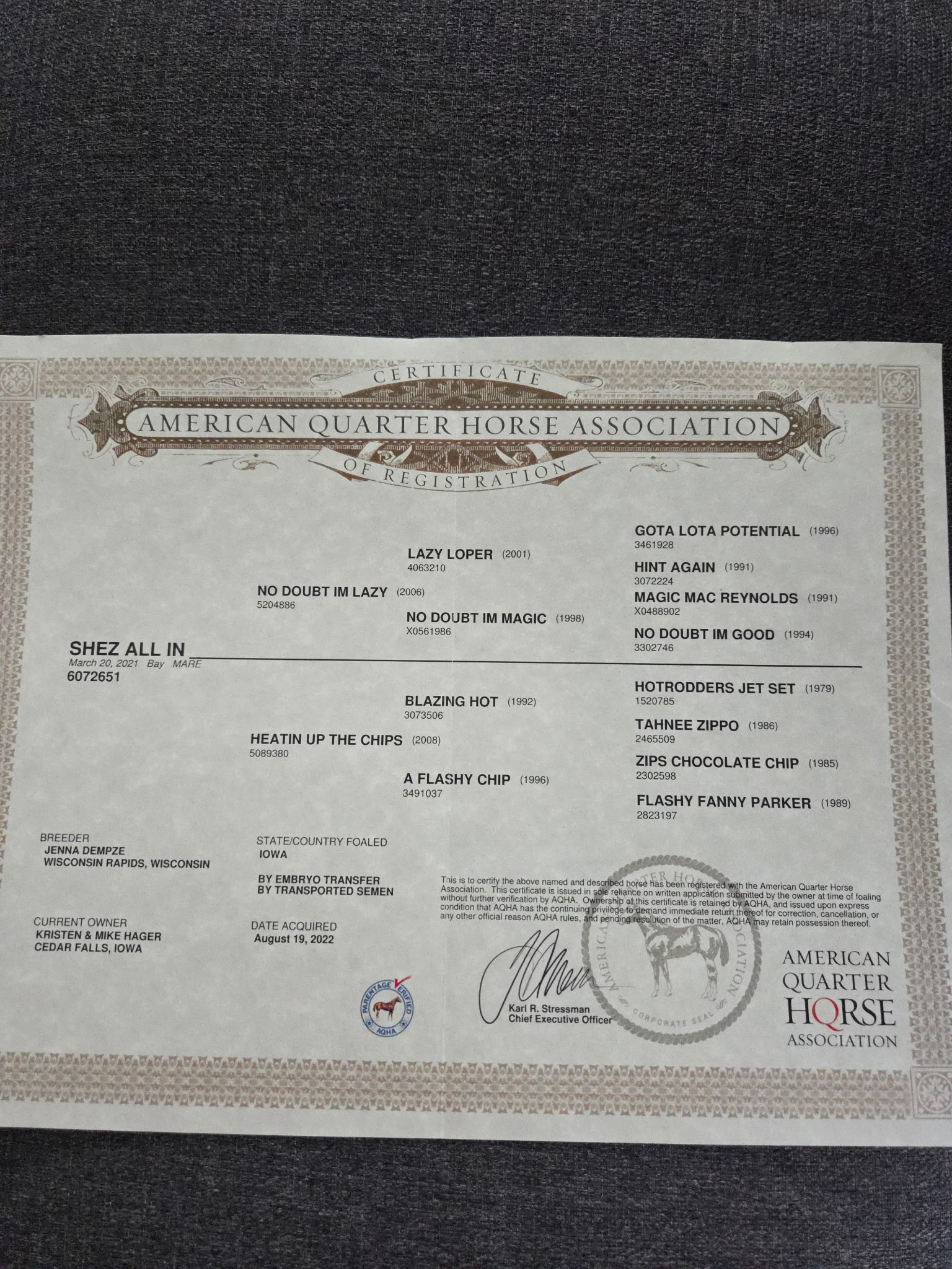 Shez All In – 4YO No Doubt Im Lazy x Blazing Hot – 15.3H est. Maiden Mare – Fancy all around/trail prospect. Has been hauled but not shown. Royal bloodlines with movement to match. Located in Nebraska. Contact Jess Bergantzel for more info at (402) 618-5751